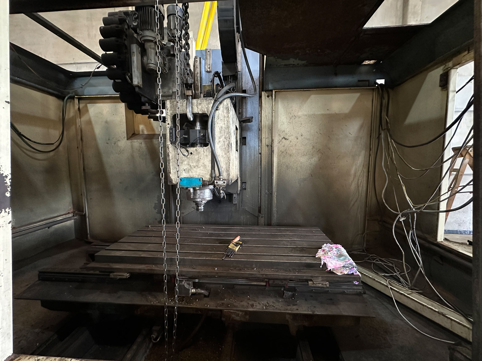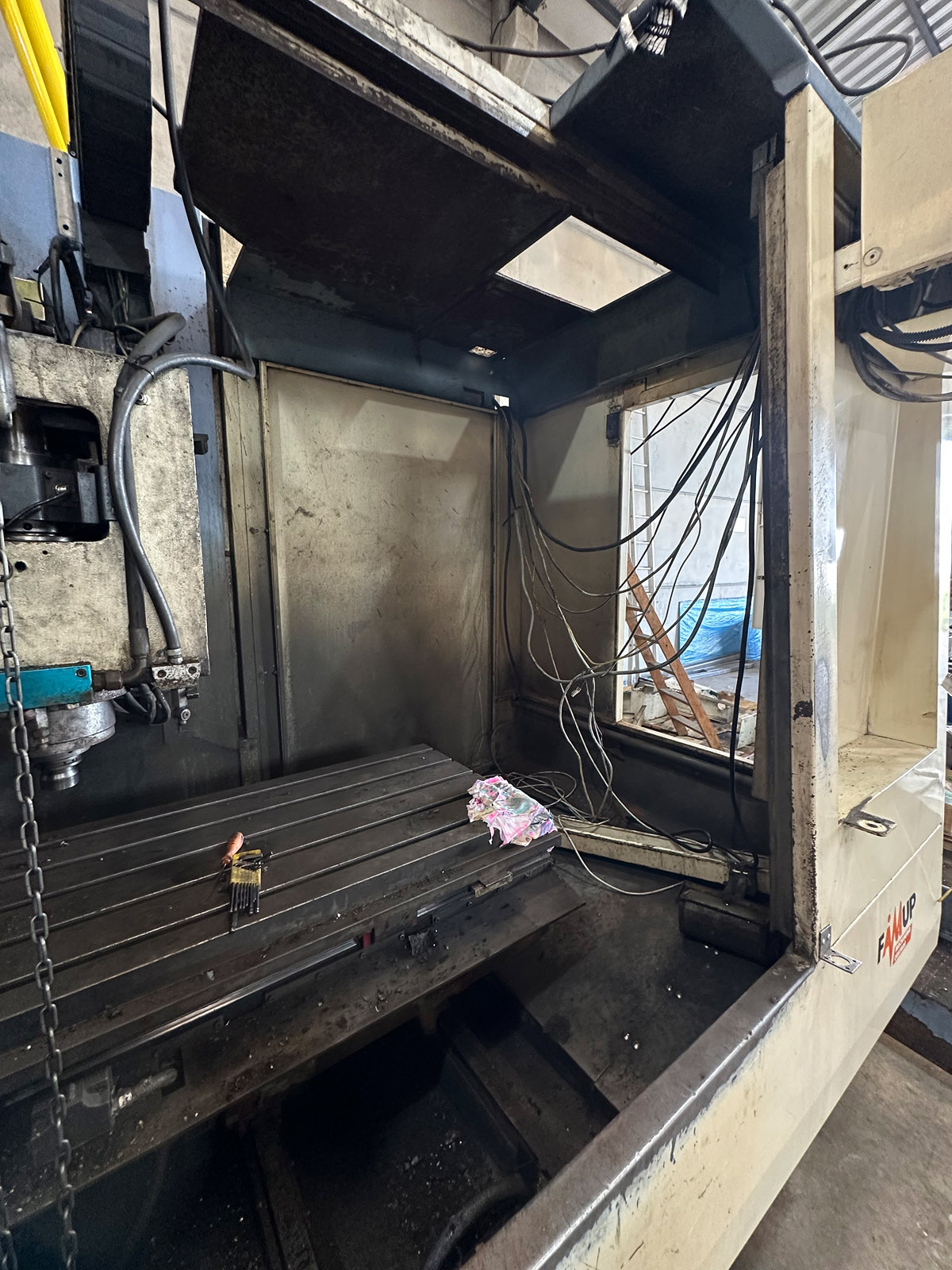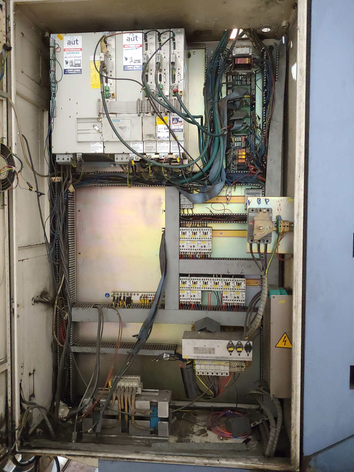 Comando Fanuc antigo, cabeçote manual enferrujado, painel elétrico bagunçado, fiação solta, máquina com cara de “já deu o que tinha que dar.